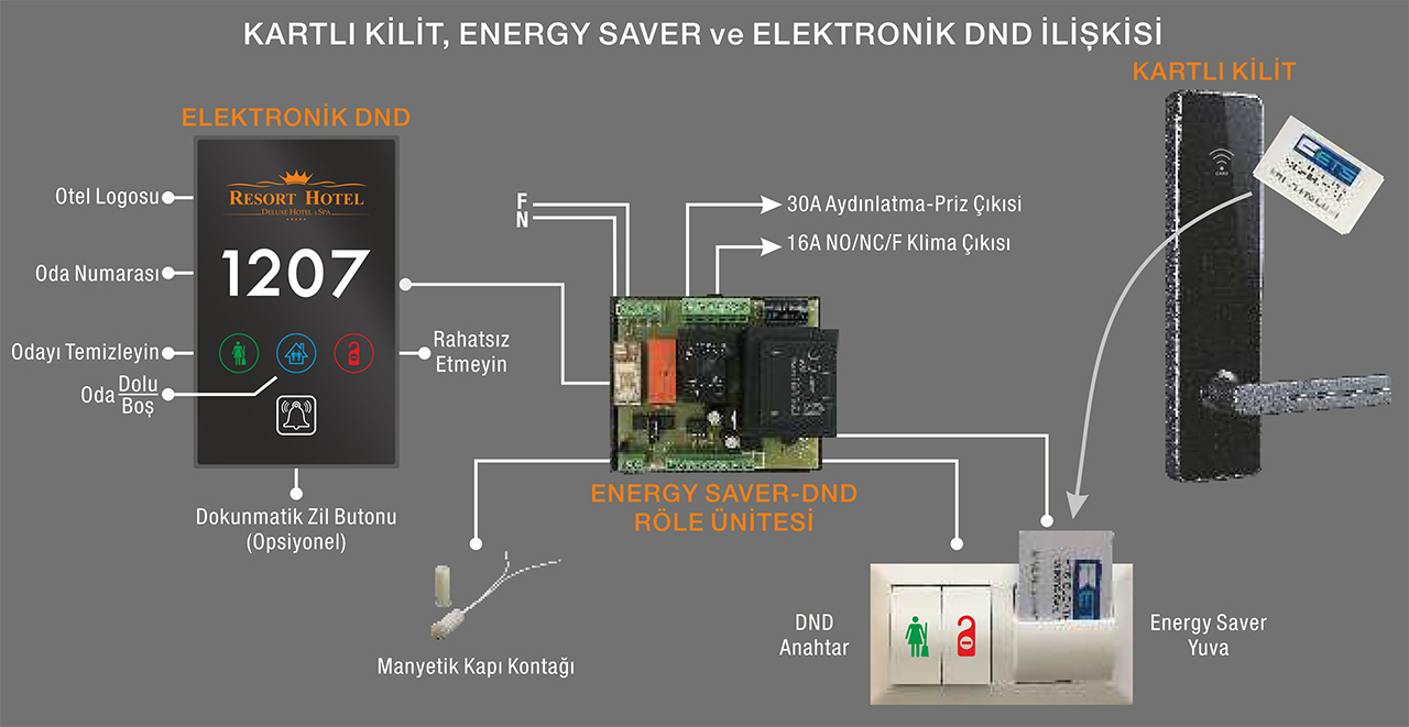 Şemada görüldüğü gibi Energy Saver ve Elektronik DND Sistemleri birbirlerine kablo ile bağlı olan, Kartlı Kilit Sistemi ise aynı kart kullanılması nedeniyle teknik olarak bağlı olan, birbirine entegre çalışan entegre sistemdir.